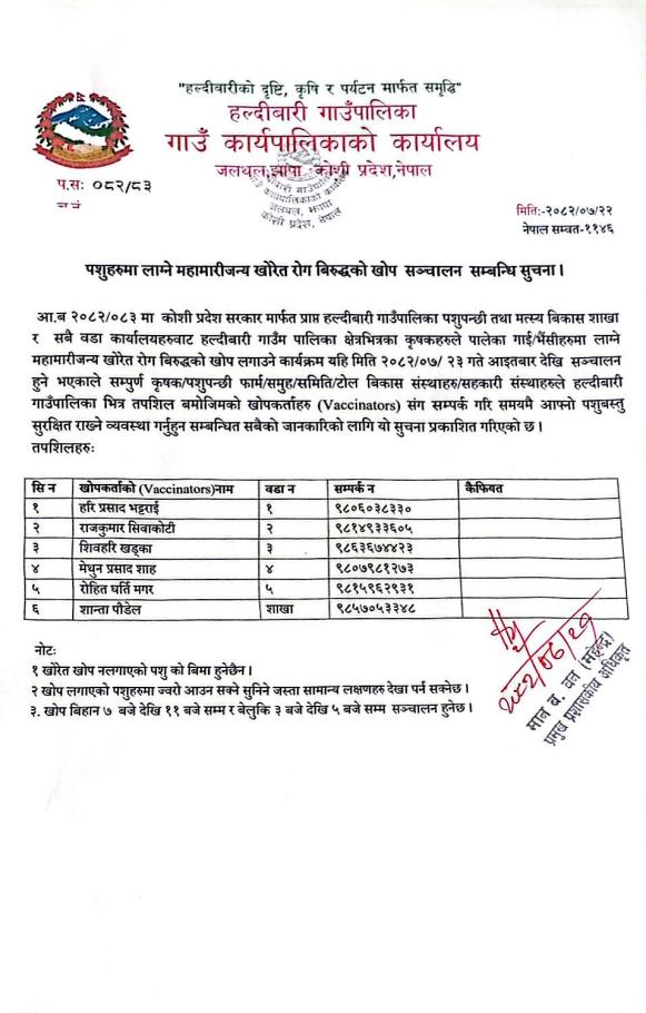 पशुहरुमा लाग्ने महामारीजन्य खोरेत रोग विरुद्धको खोप सञ्चालन सम्बन्धी सूचना ।