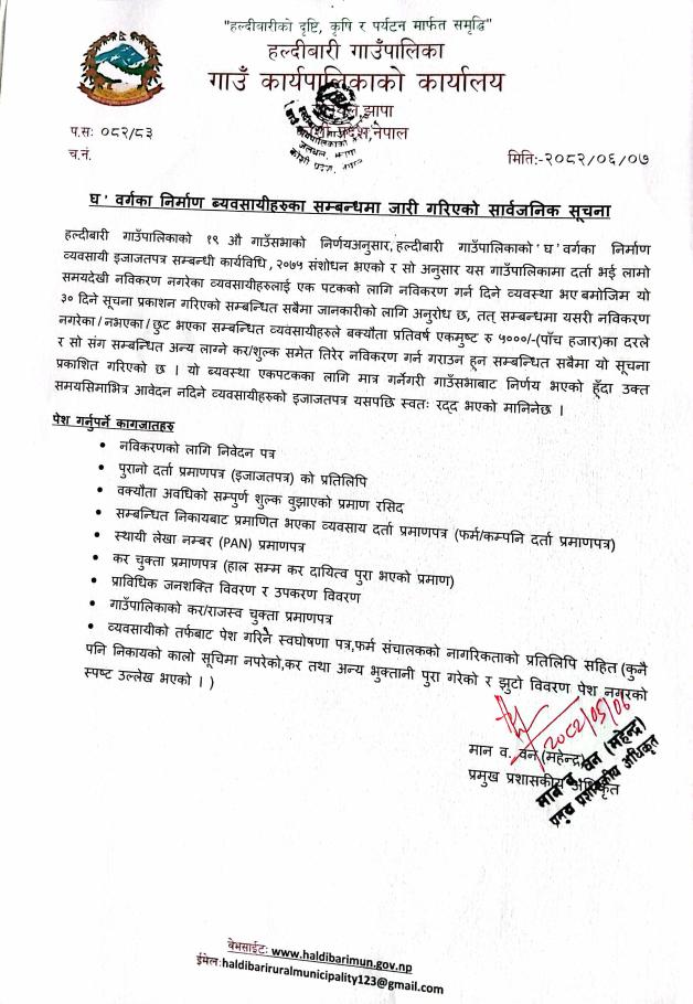 घ वर्ग निर्माण ब्यवसायीहरुका सम्बन्धमा जारी गरिएको सार्वजनिक सूचना ।