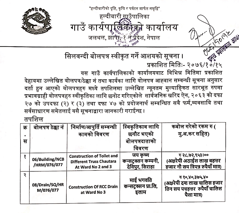 ठेक्का नं 06/Building/NCB/HRM/076/077 र 08/Drain/SQ/HRM/076/077 काे बाेलपत्र स्विकृत गर्ने आशयकाे सुचना