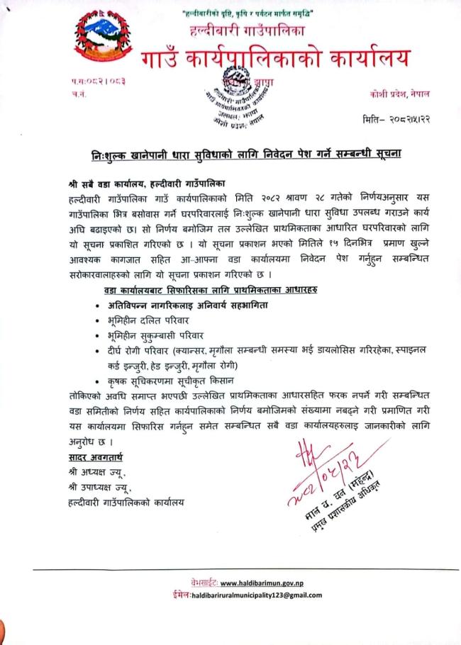 नि:शुल्क खानेपानी तथा सुविधाको लागी निवेदन पेश गर्ने सम्बन्धी सूचना ।