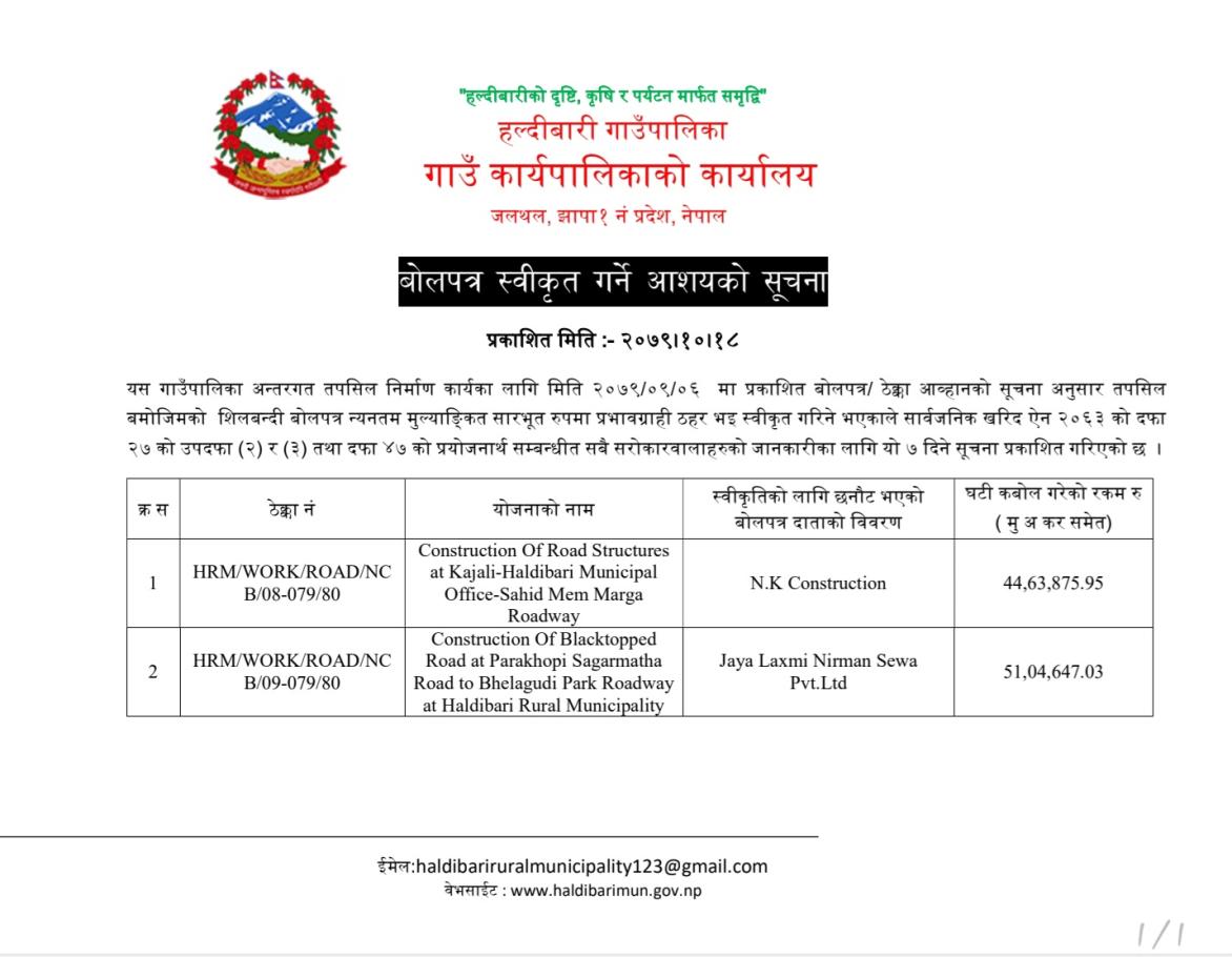 विभिन्न ठेक्काहरुको आशयको सूचना