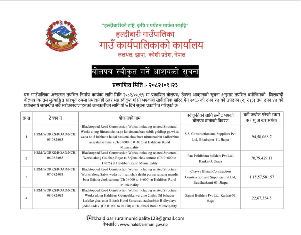 विभिन्न ठेक्का सम्बन्धिको आशयको सूचना ।