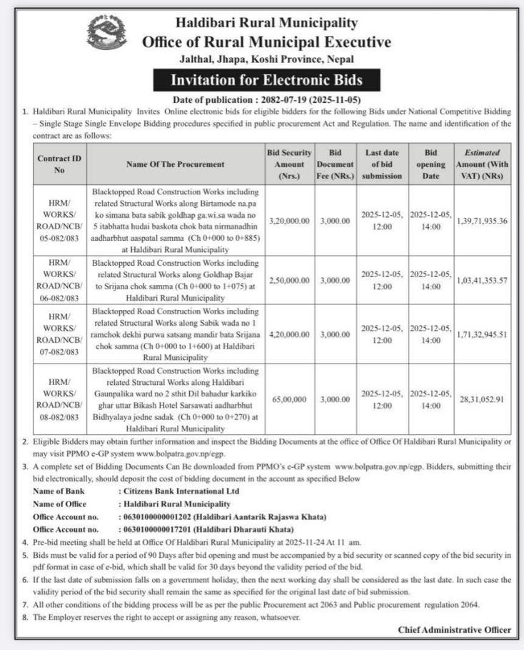 विभिन्न सडकको ठेक्का सम्बन्धि सूचना ।